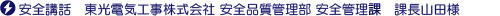 10月から全国安全週間が始まります。現場で普段忘れていたことや、見落としがちなことを再度確認し、安全週間に向けて準備していただきたい。後ほど、東光電気工事株式会社 安全品質管理部より、安全講話をしていただきますので、しっかり聞いて明日からの作業に役立ててください。