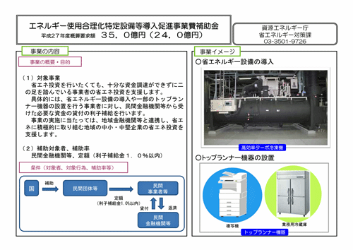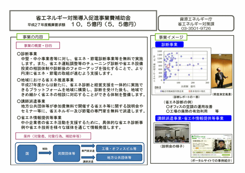 資源エネルギー庁などの国の政策によるところの取組み状況と、通称『エネ合』というエネルギー使用合理化等事業者支援補助金については、具体的に事業内容で概要・目的それに伴う条件(対象者、対象行為、補助率等)をご説明頂きました。