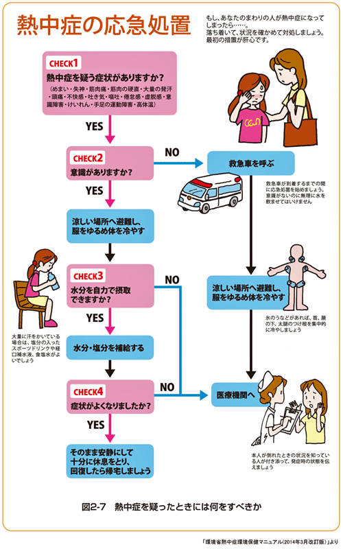 熱中症を疑った時には、何をすべきか?等の解り易い資料が掲載しています。