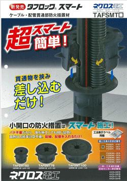 新製品のラック開口から物・工具等が落ちないように対策するためのものや軽量間柱用電線管支持金物や床貫通部区画の処理として便利そうなタフロックスマートといった今後使っていきそうな部材と出会えました。